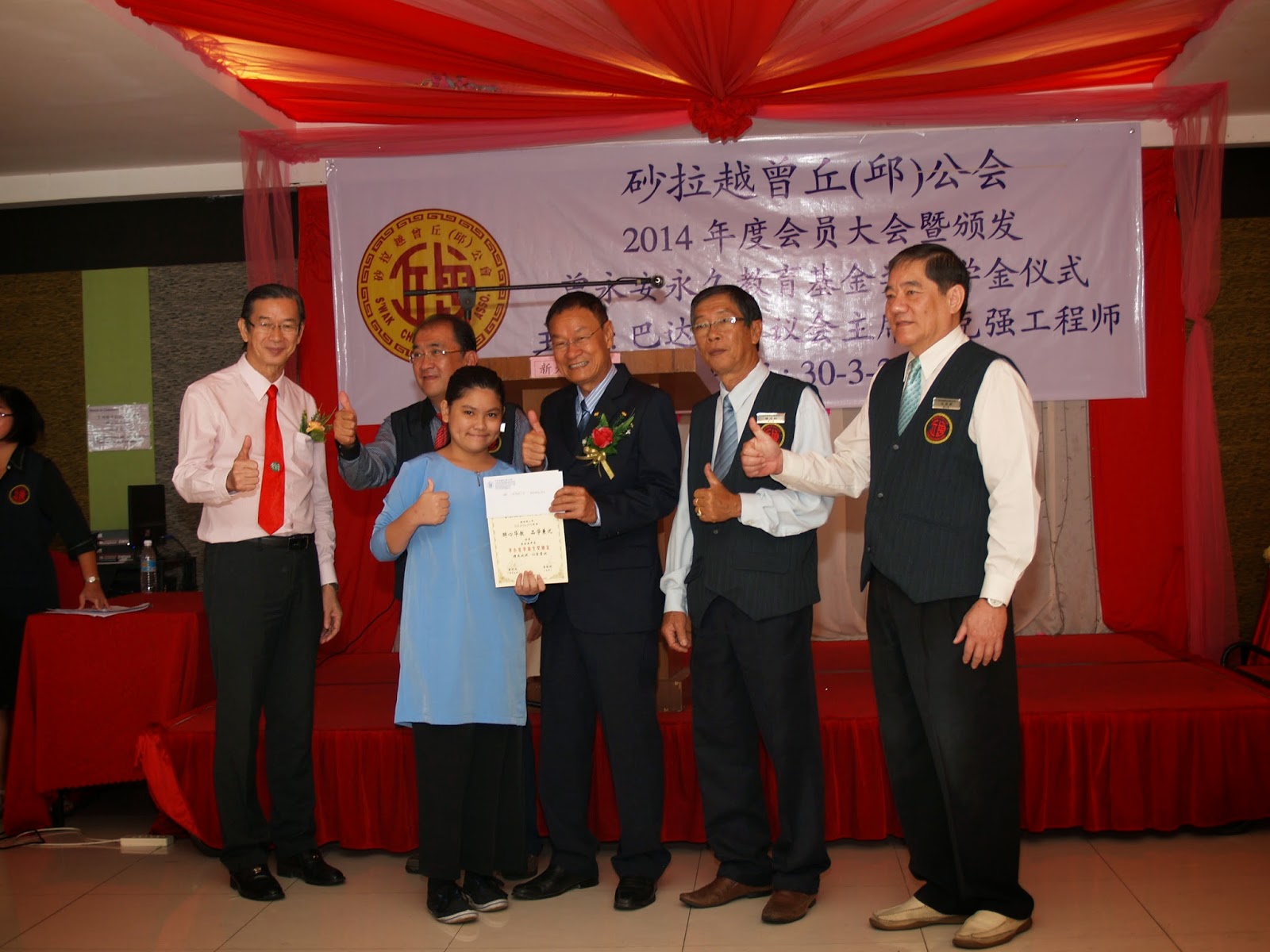 今天是本会2014年度会员大会的日子,感谢会员宗亲们本着爱护和支持公会,踴跃出席大会,有如曽丘(邱)家人大团圓的大好日子。今天除了颁发曾永安永久教育基金之奖助学金之外,也颁发敬老紅包给七十歲以上出席会员大会之年长宗亲。同时,宣佈从曾永安永久教育基金中拨出八千令吉给以下教育团体:
